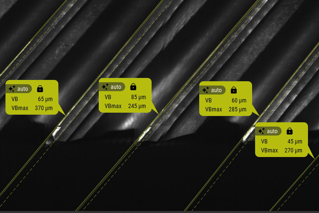 Camera VT 122 maakt in combinatie met de nieuwe versie 1.6 van de software Visual Tool Check een op AI gebaseerde slijtagemeting mogelijk, die tot nu toe handmatige processen volledig automatiseert. De snelle procesdocumentatie is in de bewerkingsprocessen geïntegreerd en biedt een doorslaggevend voordeel voor meer dan alleen de sectoren aerospace en medical. De gebruiker stuurt de op AI gebaseerde slijtagemeting heel eenvoudig aan via de VTC-cycli. De besturing verplaatst het gereedschap dan met een langzaam draaiende spil vóór de camera. Zo ontstaat een panoramaopname van het gereedschap langs alle snijkanten. De software Visual Tool Check 1.6 bepaalt daaruit volautomatisch de slijtage van de vrije vlakken.